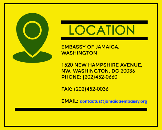 The Embassy of Jamaica in Washington is the office of the Ministry of Foreign Affairs and Foreign Trade of Jamaica that is responsible for the promotion and protection of Jamaica’s interests in the United States Of America The Embassy works to strengthen Jamaica’s bilateral relations and advance bilateral cooperation. The Embassy is dedicated to supporting and empowering the Jamaican Diaspora and ensuring that all Jamaican nationals within our jurisdiction have expeditious access to high-quality consular services. If you need additional information or clarification on a matter, please send us an email at contactus@jamaicaembassy.org for assistance.